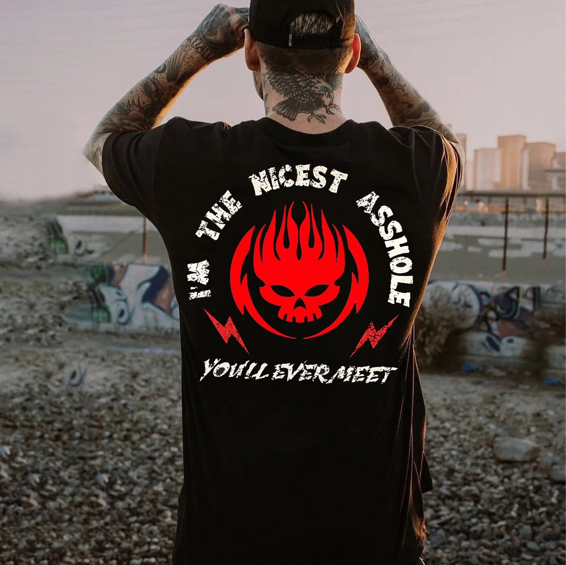 I'M THE NICEST ASSHOLE Red Skull Graffiti Black Print T-shirt